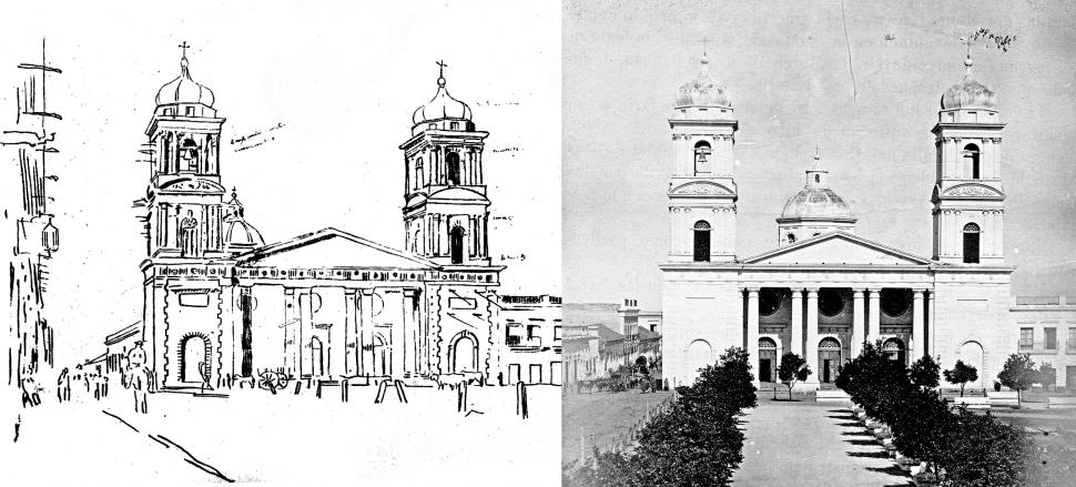 CATEDRAL. En 1858, en la versión a lápiz de León Pallière, con trazos precisos y descriptivos, y en 1870 -12 años después- el templo en la fotografía de Ángel Paganelli.