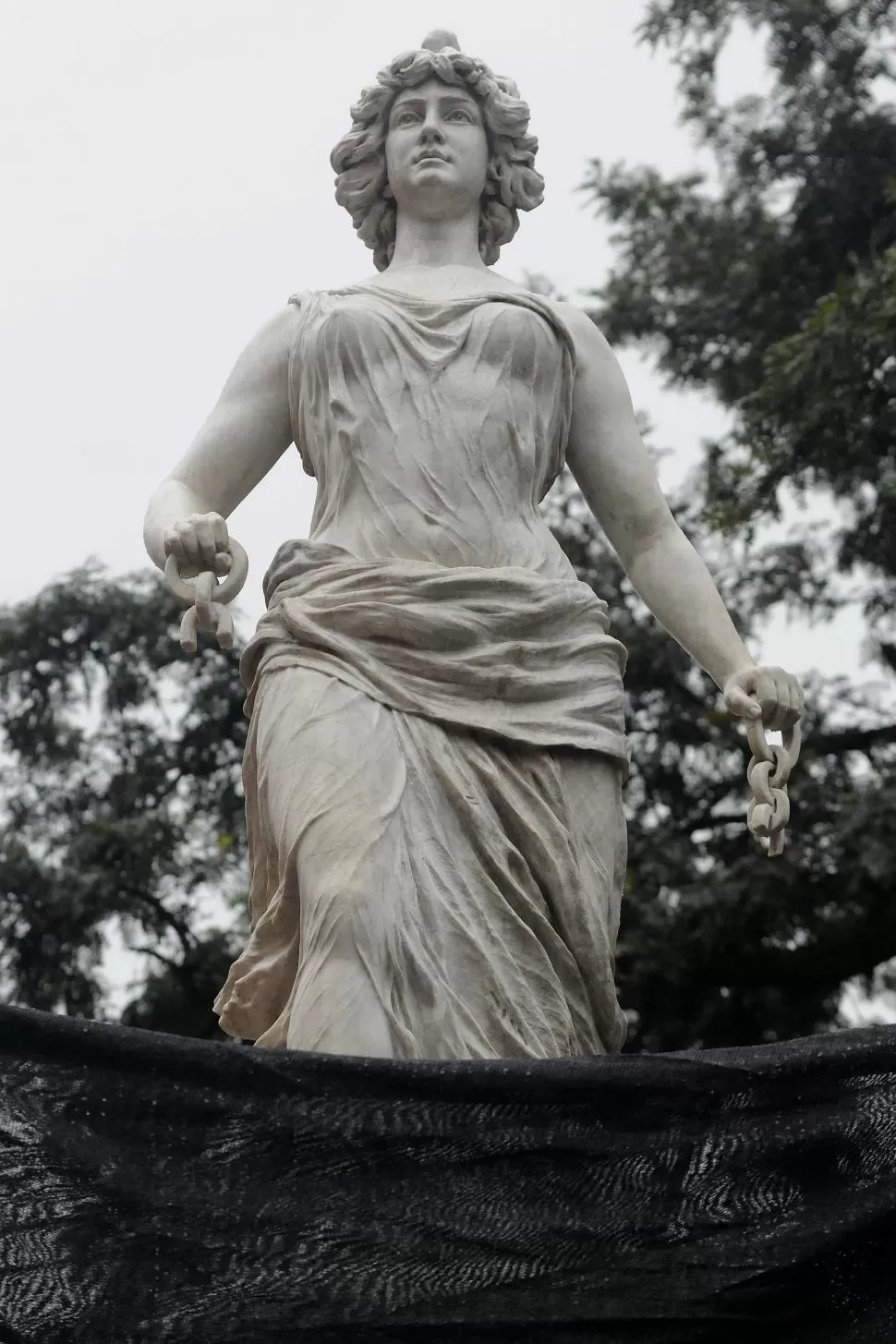 La premisa es dejarla reluciente, que pueda recuperar el brillo propio y que luzca la blancura de cuerpo entero con el vestido al viento y sus cabellos entrelazados hacia atrás. Portentosa, segura, convincente mira al horizonte con los trozos de cadena en cada mano en un simbólico grito libertario. Es una de las obras más emblemáticas de la escultora tucumana Lola Mora. Fue construida en mármol, mientras la escultora se encontraba en Europa y se la emplazó en su sitio en 1904.