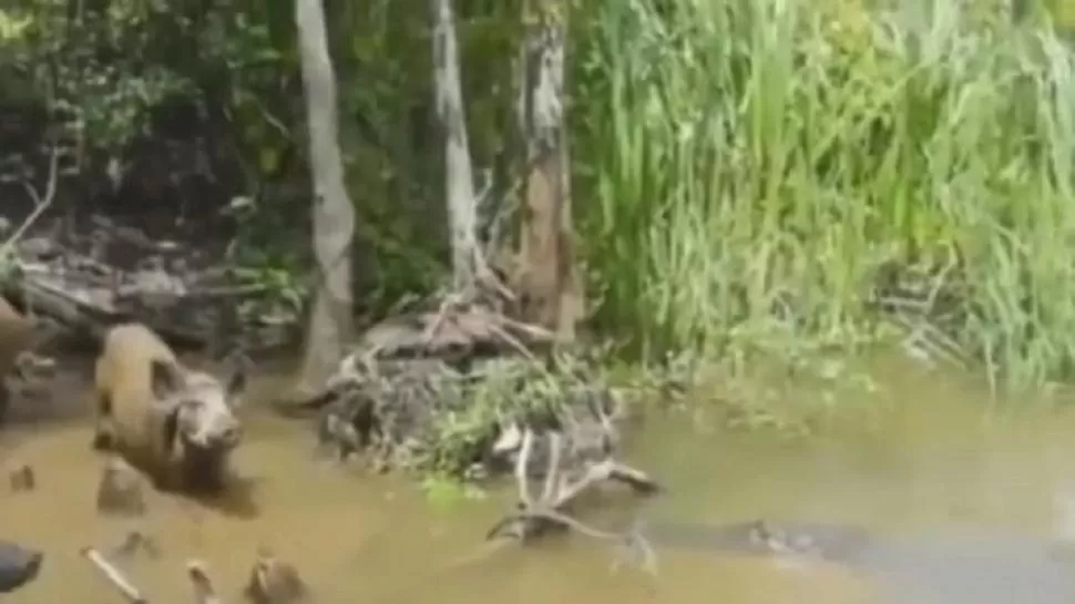 Las imágenes muestran a un grupo de personas navegando por las aguas del río Misisipi, en el estado de Luisiana, Estados Unidos. Al observar una manada de cerdos silvestres, algunos visitantes comenzaron a lanzar alimento, provocando que uno de los animales se adentre a las aguas, donde un cocodrilo de gran tamaño esperaba por su presa.