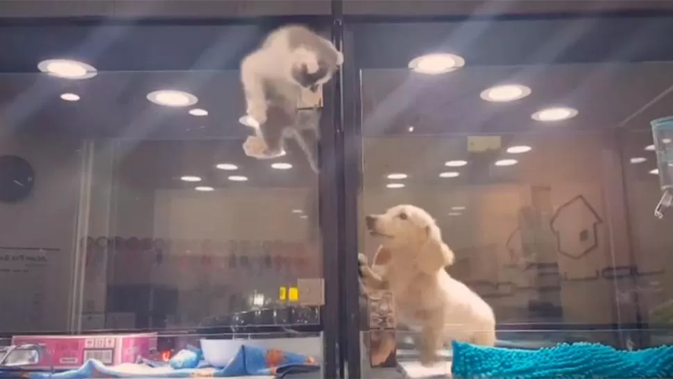 Un video filmado en una tienda de mascotas de la ciudad taiwanesa de Taipei muestra la desesperación de un gato por pasarse a la vitrina de un perro, que lo apoya con mucho entusiasmo.