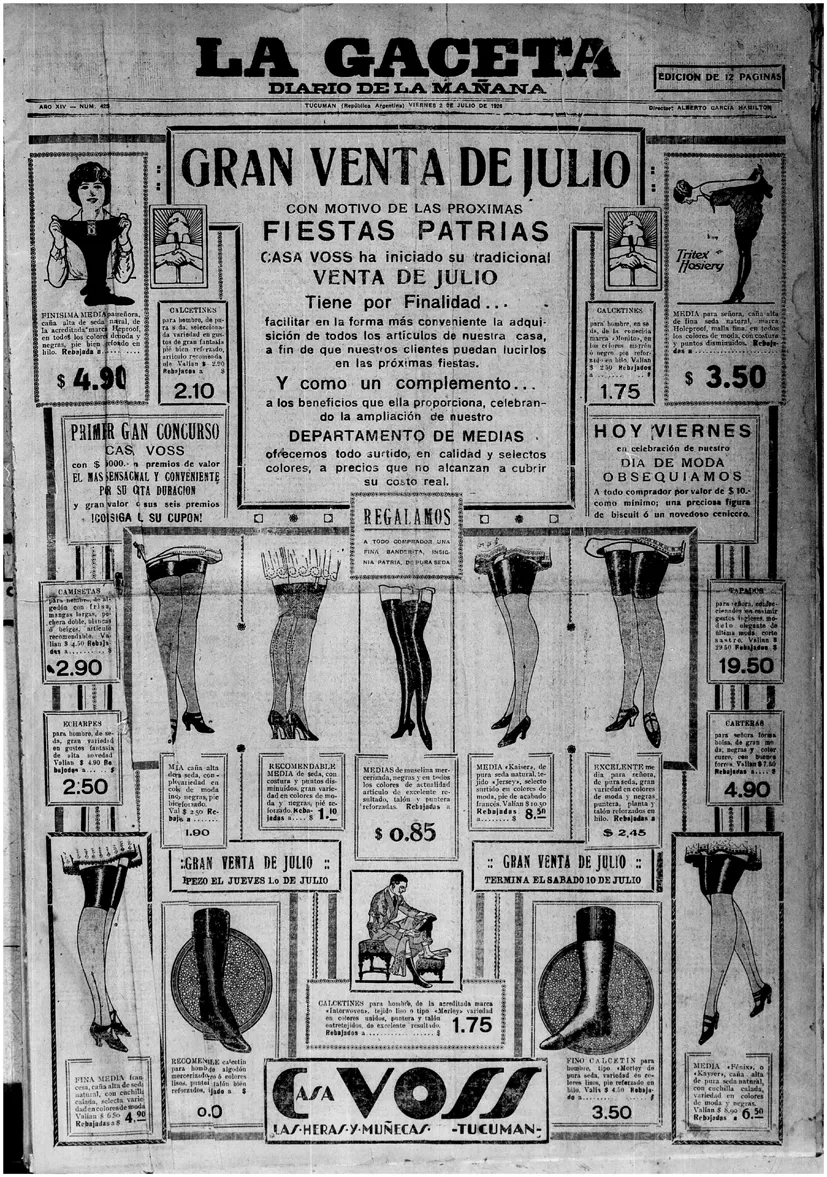 Hace 80 años los tucumanos vivían a pleno las vísperas de la fiesta de nuestra Independencia. Todo se aprestaba diligentemente. Las banderas engalanaban las calles. Las madres corrían de un lugar a otro para aprestar las uniformes de los más pequeños que iba a desfilar ante las autoridades con sus mejores galas. Todo era expectativa. En la misma espiral entraba el comercio, que potenciaba sus ofertas en todas sus variedades: ropas, zapatos, pantalones, vestidos, sacones, tapados, sobretodos, sin faltar el menaje y los artículos de bazar. Con la frase “ofertas de julio” la publicidad que aparecía en nuestro diario -y en especial en nuestra tapa, donde aún no había noticias-, presentaba grande espacios con dibujos y detalles de los elementos ofrecidos al público. Como vemos, las ofertas ya por aquellos años eran protagonistas en el devenir del diario y los tucumanos las esperaban, al igual que a las noticias. La simbiosis entre medios de comunicación y publicidad es histórica. Para los comercios presentar en momentos especiales sus novedades y productos con rebajas era fundamental y que llegara a una mayor cantidad de público era clave para el éxito del negocio.