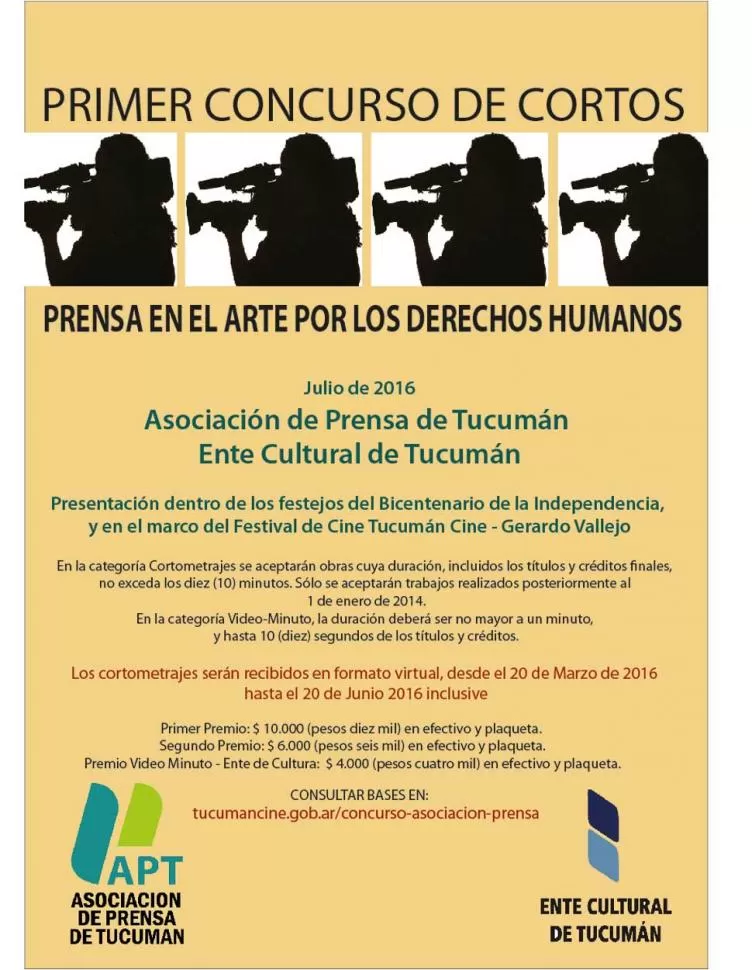El Primer Concurso de Cortos Cinematográficos que organiza la Asociación de Prensa de Tucumán (APT) prorrogó su fecha de cierre hasta el 9 de septiembre. Las bases pueden consultarse en http://prensaenelarteporlosderechoshumanos.blogspot.com.ar/