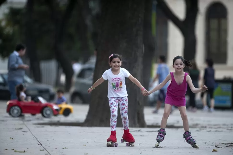A LA PAR. Azul Lefevbre (con patines) y Solana Fuentes (con rollers), ambas de 6 años, son compañeras del colegio, y suelen patinar juntas en la plaza Urquiza. LA GACETA / FOTOS DE DIEGO ARÁOZ