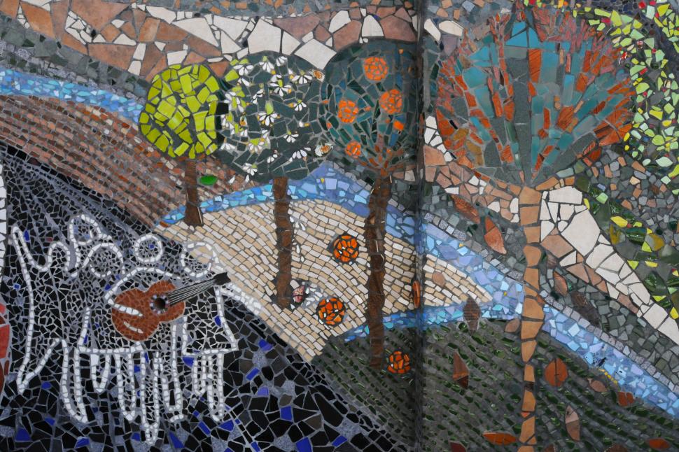 En detalle, se ven signos de la vida barrial, como el Mercado de Abasto, elementos de la plaza Belgrano, que está muy cerca; niños jugando; las cuatro estaciones, representadas por naranjos en sus cuatro estados (hasta plasmaron flores de azahar realizadas con minúsculos trozos de cerámicos); la iglesia antigua y la nueva; y la palabra, que fue representada por un libro abierto, cuyas palabras vuelan como pájaros. ¿Qué más se puede descubrir? Si se toman unos minutos para observar, comienzan a aparecer un unicornio azul (inspirado en la canción de Silvio Rodríguez), un puente amarillo (recuerden el tema “Cantata de puentes amarillos”, de Pescado Rabioso), un sol con los colores del club San Martín, una oveja negra entre otras blancas y un agujero que muestra que detrás todavía hay un mundo. Hay más, pero queda en uno descubrirlo.