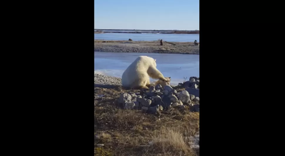 El insólito hecho sucedió en la ciudad de Churchil, a 1000 kilometros al norte de Winnipeg, en Canadá. En las imágenes se ve como el animal salvaje se acerca a un perro de trineo que se encontraba encadenado y lo acaricia cariñosamente, como si ambos se conocieran de toda la vida.