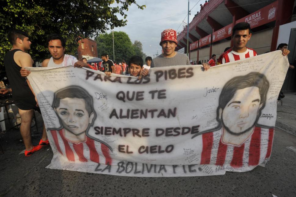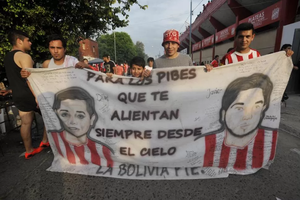 Además del dibujo de los rostros de Nahuel y de Javier, la tela blanca lleva la firma de “La Bolivia”. “Tenemos un equipo de fútbol en el barrio, que se llama ‘La Bolivia’, jugamos en Campo Norte. Y esto fue idea de todos nosotros, éramos compañeros de fútbol”, cuentan. En la bandera también pueden leerse decenas de dedicatorias. “Son familiares de Nahuel y de Javier, la gente del barrio, sus amigos”, explican. Y añaden un dato que emociona: firmaron por igual “cirujas” y “decanos”: “la cuadra está dividida. Somos cerca de 30. La mitad es hincha de San Martín y la otra mitad, de Atlético. Todos los de Atlético firmaron. Entre nosotros existe la rivalidad futbolística, pero no hay pelea, somos hermanos, amigos”.