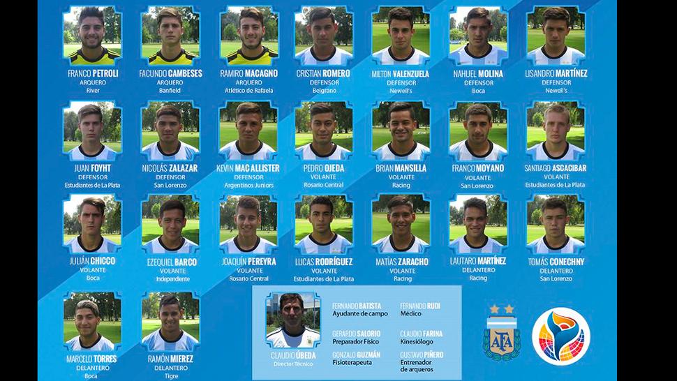 BUENOS AIRES.- El entrenador del seleccionado argentino Sub-20, Claudio Ubeda, dio a conocer hoy la lista de 23 jugadores que representarán a la AFA en el torneo sudamericano de Ecuador, en el que habrá en juego cuatro plazas para el Mundial en Corea del Sur.