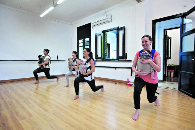 La clase comienza con ejercicios de resistencia muscular en el piso, en los que a veces los bebés son “pesas” que pueden ubicarse en las canillas o el abdomen. Luego, los pequeños pasan a los portabebés ergonómicos, y con ellos bailan y hacen ejercicios de resistencia muscular ya paradas. Tienen un peso extra encima. Mejor.