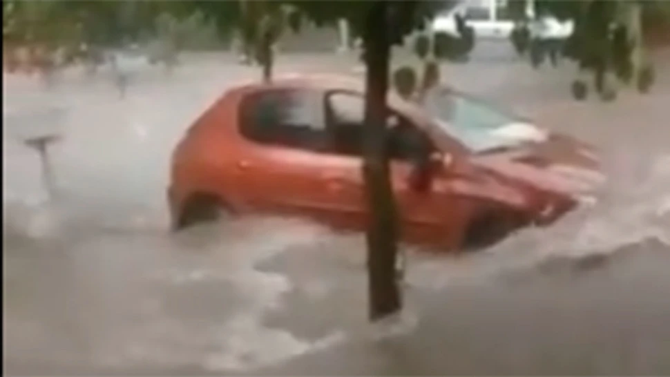Un auto que se encontraba estacionado en calle Muñecas al 1.600 fue arrastrado varios metros por la corriente de agua que se formó luego de la tormenta que azotó esta tarde a la provincia.