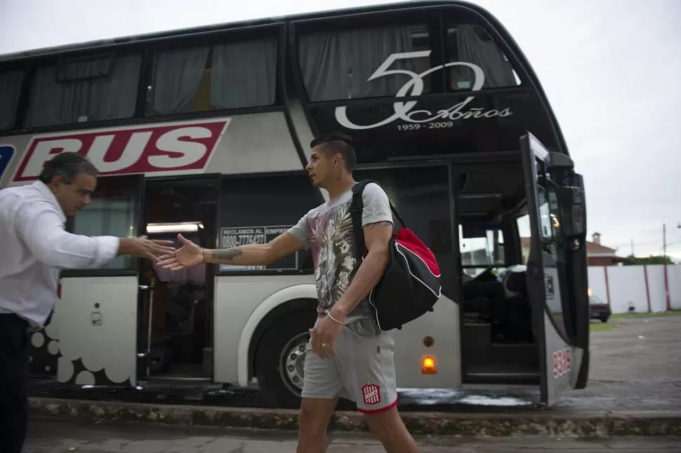 EL PRIMERO. Nicolás Carrizo fue el primero de la delegación “santa”, que ayer viajó rumbo a Pergamino, en llegar a La Ciudadela. De muy buen ánimo, el arquero saludó efusivamente a los choferes. la gaceta / fotos de FOTO DE JORGE OLMOS SGROSSO