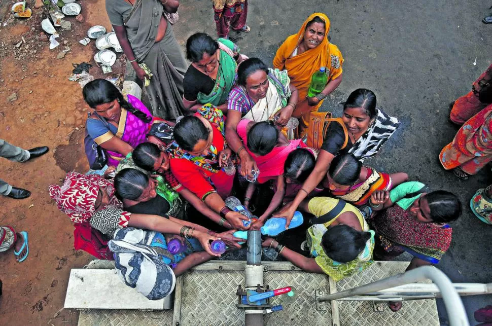 EN BENGALURU, INDIA. La imagen fue tomada ayer, y esto ocurre todos los días. La gente va a llenar sus botellas de agua en un camión municipal que pasa repartiendo. REUTERS
