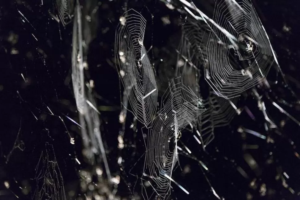 Tejieron un laberinto verdadero, frágil, a gran escala, con diseños orbitales circulares y otros con formas alargadas; esquinas pobladas con decenas de pequeñas redes y lugares de la sala cruzados sólo por filamentos de seda solitarios. Al acercarse aún más, pueden apreciarse diminutas motas de polvo enganchadas en los hilos; algunos ácaros habrán corrido la misma suerte.