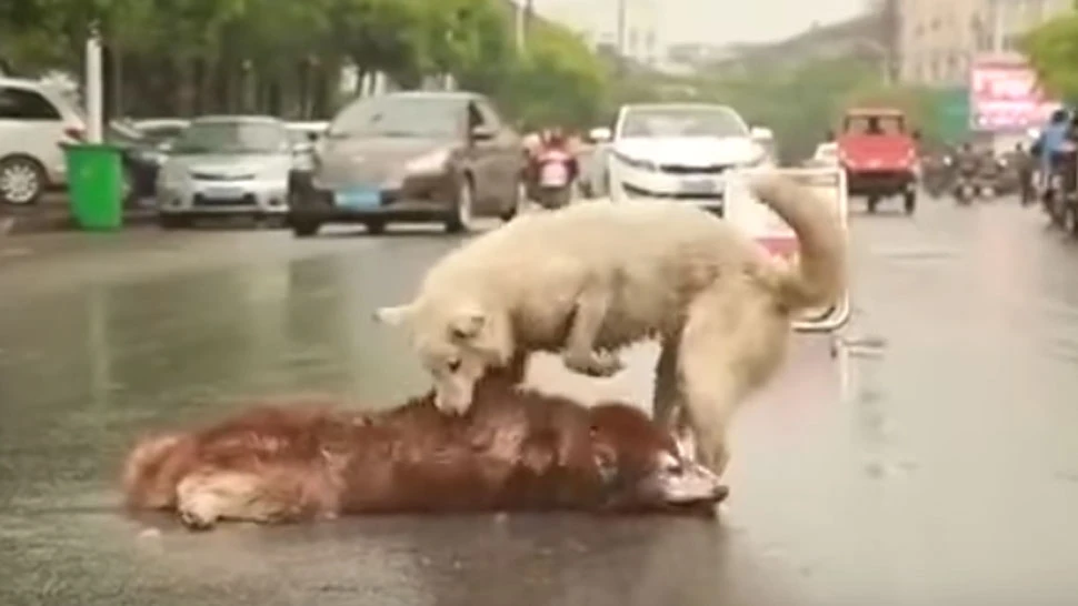 YouTube, se ve a un can que trata de ayudar desesperamente a su amigo, quien se encuentra sin vida tras ser atropellado en una ruta de China.