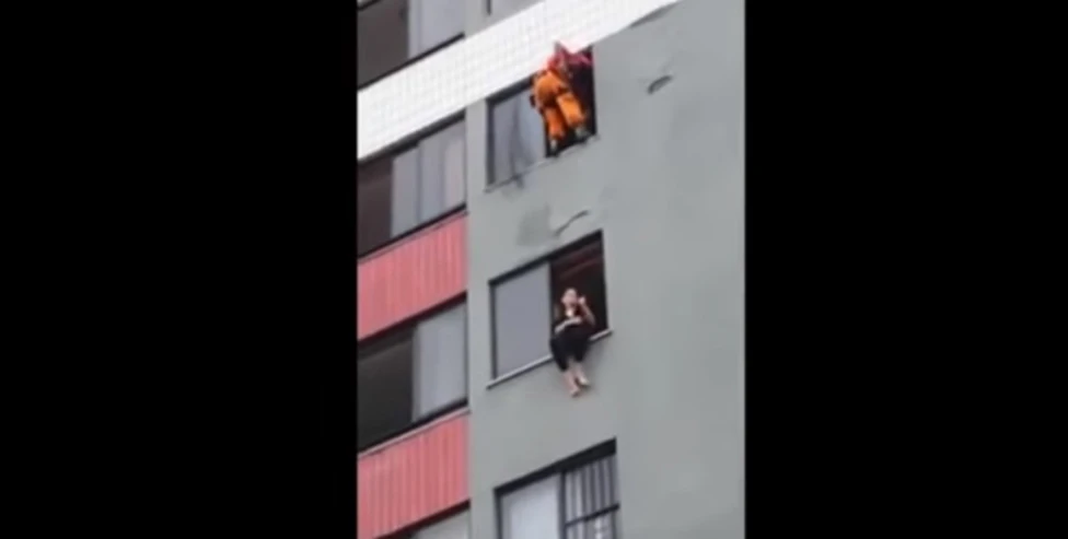 Sucede que una mujer amenazó con tirarse del balcón de un edificio. Así que, desde la ventana de arriba, bajó un bombero que de una patada empujo a la chica hacia adentro e impidió que se tirara.