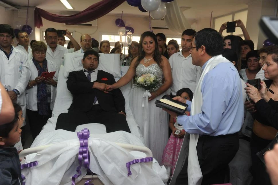 “Hace tiempo veníamos pensando en casarnos, pero como mañana (por hoy) le tienen que hacer una operación bastante riesgosa, él me ha pedido que nos casemos ahora nomás”, cuenta Ivana. Habla tomando la débil mano de su esposo, la que tiene el suero y también el anillo recién bendecido por el capellán del hospital, el padre Sergio Costilla. Con la otra mano la joven de 20 años se aferra a su ramo de rosas amarillas, blancas y color salmón, que resalta con su vestido inmaculado.