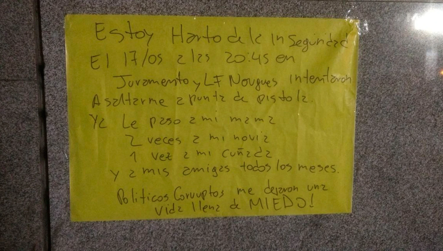 "Estoy harto de la inseguridad. El 17/05 a las 20.45, en Juramento y LF Nougues, intentaron asaltarme a punta de pistola. Ya le pasó a mi mamá, dos veces a mi novia, una vez a mi cuñada y a mis amigas todos los meses. Políticos corruptos, me dejaron una vida llena de miedo", decían los carteles anónimos que aparecieron hoy en el centro. Sin embargo, con el correr de las horas, se viralizó el video en el que el protagonista del mensaje explicó porqué tuvo esa iniciativa.
