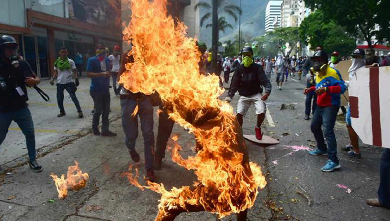 El gobierno venezolano denunció que manifestantes opositores prendieron fuego a un hombre durante una protesta en Caracas, ayer, contra el gobierno de Nicolás Maduro.