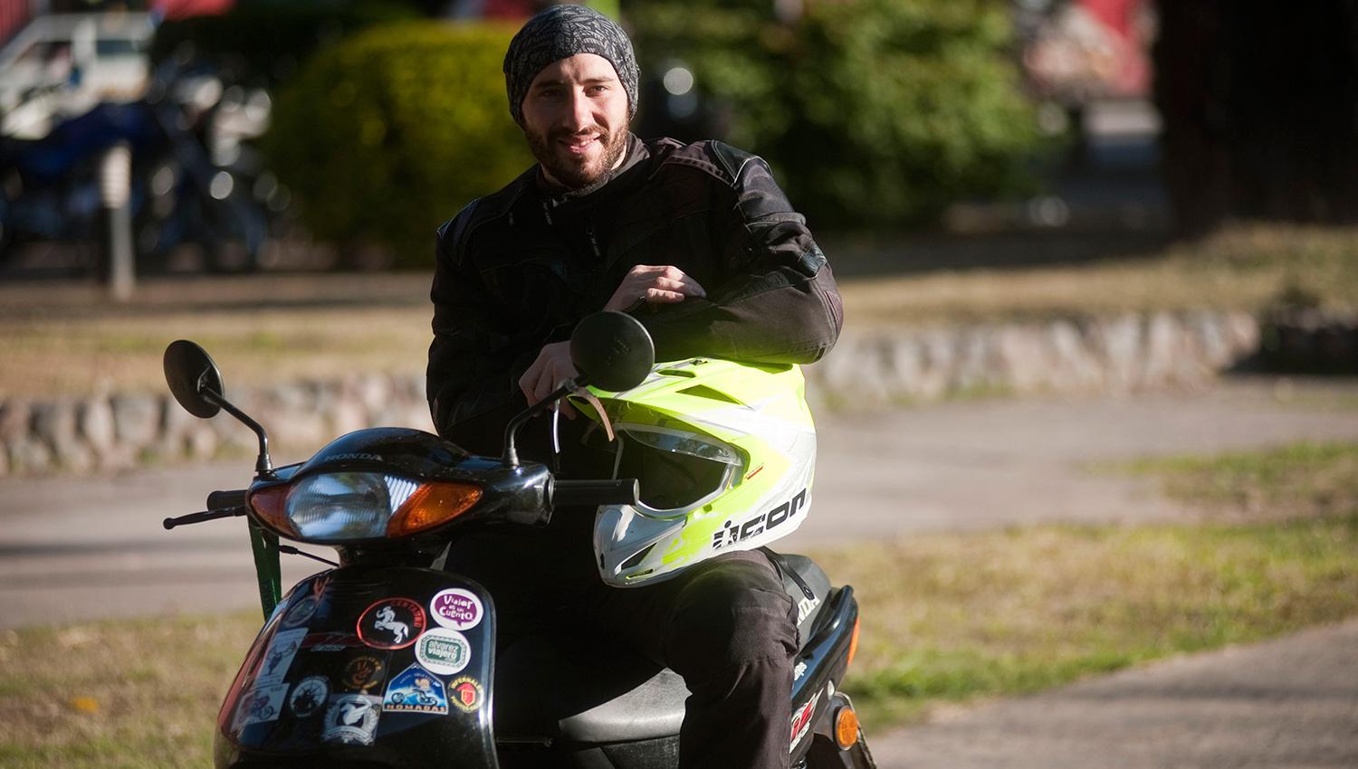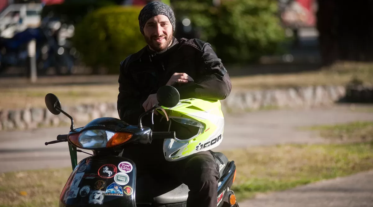 YAGO Y LA ESTIRPE DE LAS VIZCACHAS. Damián Lorenz es cordobés, tiene 29 años y desde los 22 que viaja en su Honda Biz de 105 cc. El año pasado cambió su legendaria “Vizcacha” (roja) por la misma en color negro, “Vizcacha II”. LA GACETA/FOTO DE INÉS QUINTEROS ORIO