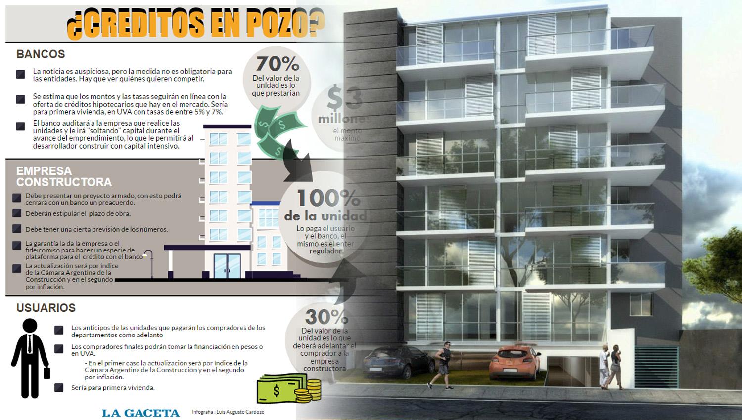 - En Tucumán, el acceso al proyecto "en pozo" oscila entre un 20% y un 40% del valor de la unidad, según la constructora; a su vez, la financiación está sujeta a cada desarrollador: puede ser hasta la entrega de la unidad o hasta un plazo de 20 años.