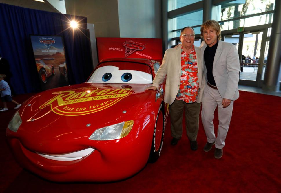 Un prototipo de Rayo McQueen fue exhibido en California para el estreno de “Cars 3”. John Lasseter, director de Pixar y el actor Owen Wilson posan durante la muestra.