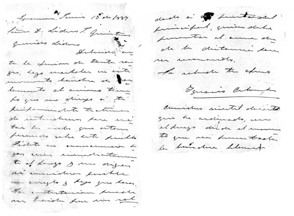 “Señor D. Lídoro J. Quinteros. Querido Lídoro: Dolorido ante la efusión de tanta sangre, hago enarbolar en este momento bandera de parlamento al mismo tiempo que me dirijo a tí proponiendo que tratemos de entendernos para evitar los males que están pasando sobre este pueblo. Pídote en consecuencia hagas cesar inmediatamente el fuego y me digas si consideras posible un arreglo y bajo qué bases. Tu contestación puede ser traída por un soldado a la puerta del principal, quien debe presentar el arma desde la distancia para ser reconocido. Te saluda tu afmo. Ignacio Colombres”.