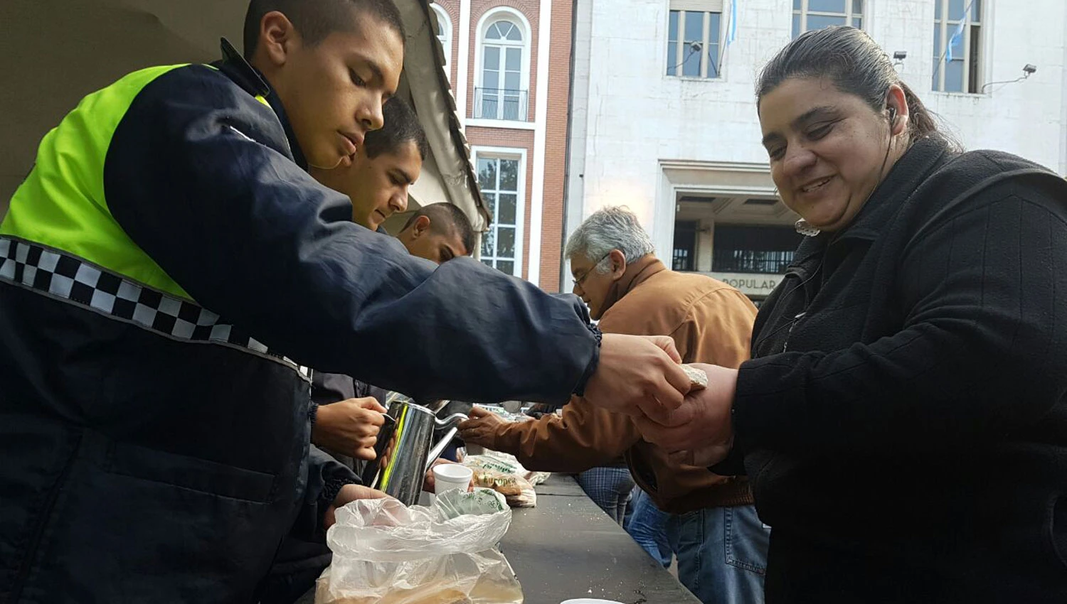 En distintos puntos de la plaza fueron dispuestos gazebos en los que se prepararon varios ollas de chocolate. Los encargados de servirlo son los policías. Los actos oficiales comenzaron con más de media hora de demora, por lo que la agenda de actividades sufrió un pequeño corrimiento.