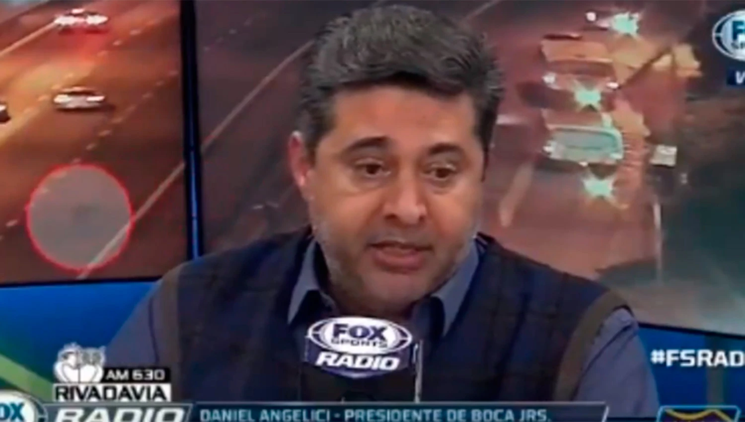 Detrás del presidente de Boca la pantalla mostraban una parte de Acceso Norte y General Paz, en la Capital Federal, donde se percibió cómo dos individuos asaltaban en plena vía pública.