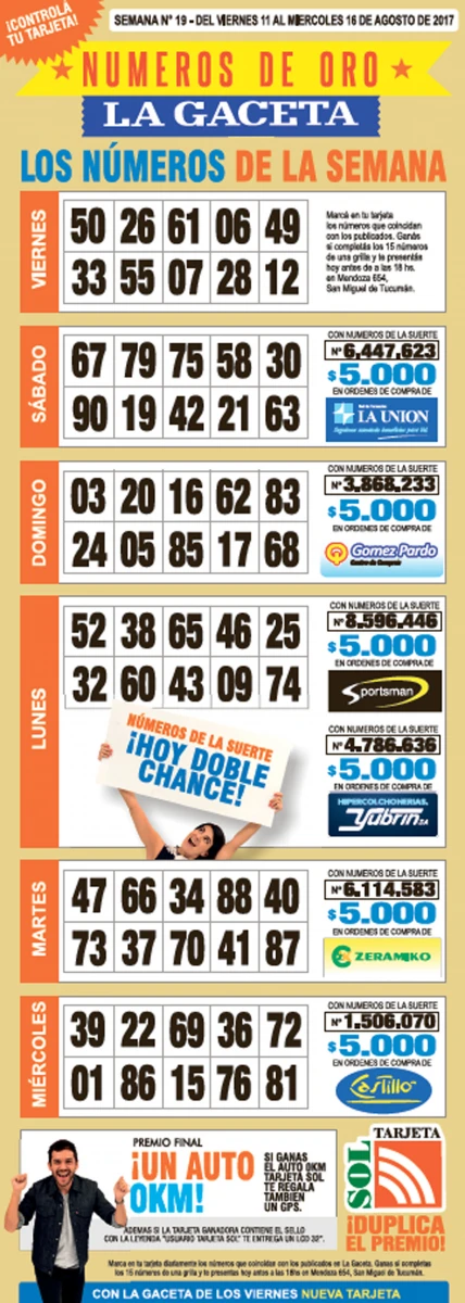<p>Como cada miércoles, se publicó la grilla completa de los Números de Oro de LA GACETA para que los lectores puedan revisar sus tarjetas. Aquellos que completen los 15 números de una de las grillas de su cartón deberán presentarse en calle Mendoza 654 hasta las 18, que cierra la semana número 16 de Números de Oro. En caso de que el ganador sea usuario Tarjeta Sol, duplica el premio.</p>