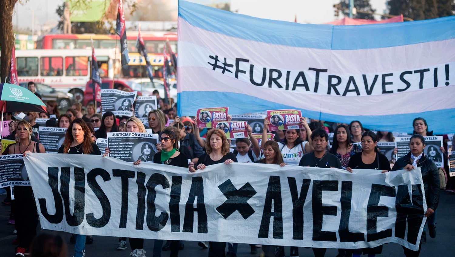 "Basta de trasnfemicidios, basta de travesticidios, basta de trata trans, cupo laboral trans ya, cumplimiento pleno de la ley de identidad de género", fue el pedido de los carteles en blanco y negro que tenían la imagen de Ayelén.