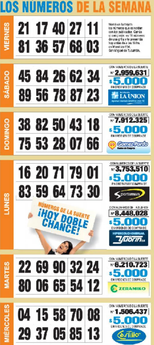 Como cada miércoles, se publicó la grilla completa de los Números de Oro de LA GACETA para que los lectores puedan revisar sus tarjetas. Aquellos que completen los 15 números de una de las grillas de su cartón deberán presentarse en calle Mendoza 654 hasta las 18, que cierra la semana número 20 de Números de Oro. En caso de que el ganador sea usuario Tarjeta Sol, duplica el premio.