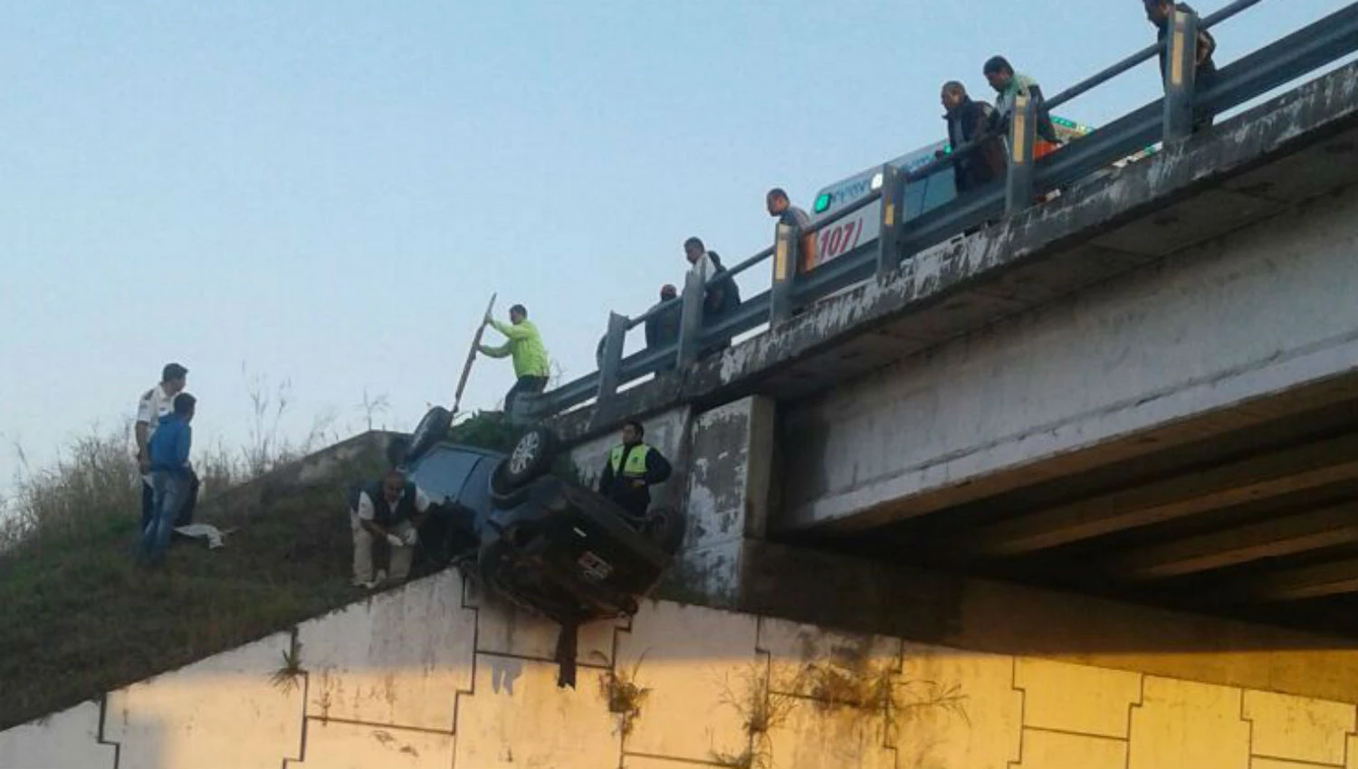 Un insólito accidente vial se registró esta mañana en el puente que cruza la autopista a Famaillá, a la altura de Campo Herrera. Allí, personal de la Policía, de Bomberos y del 107 rescató a una mujer que se encontraba atrapada dentro de un automóvil que estaba a punto de caer.