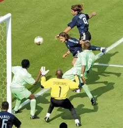 Los tiros de esquina ejecutados por Verón lastimaron a la defensa nigeriana: Batistuta con el pie, Sorín de palomita y Mauricio Pochettino desde un ángulo cerrado no lograron meterla.