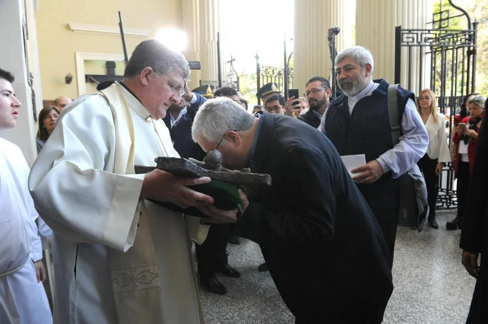 El todavía párroco Carlos Sánchez, al ingresar en la Catedral, besa la Cruz que sostiene el párroco de esa iglesia, Marcelo Barrionuevo.
