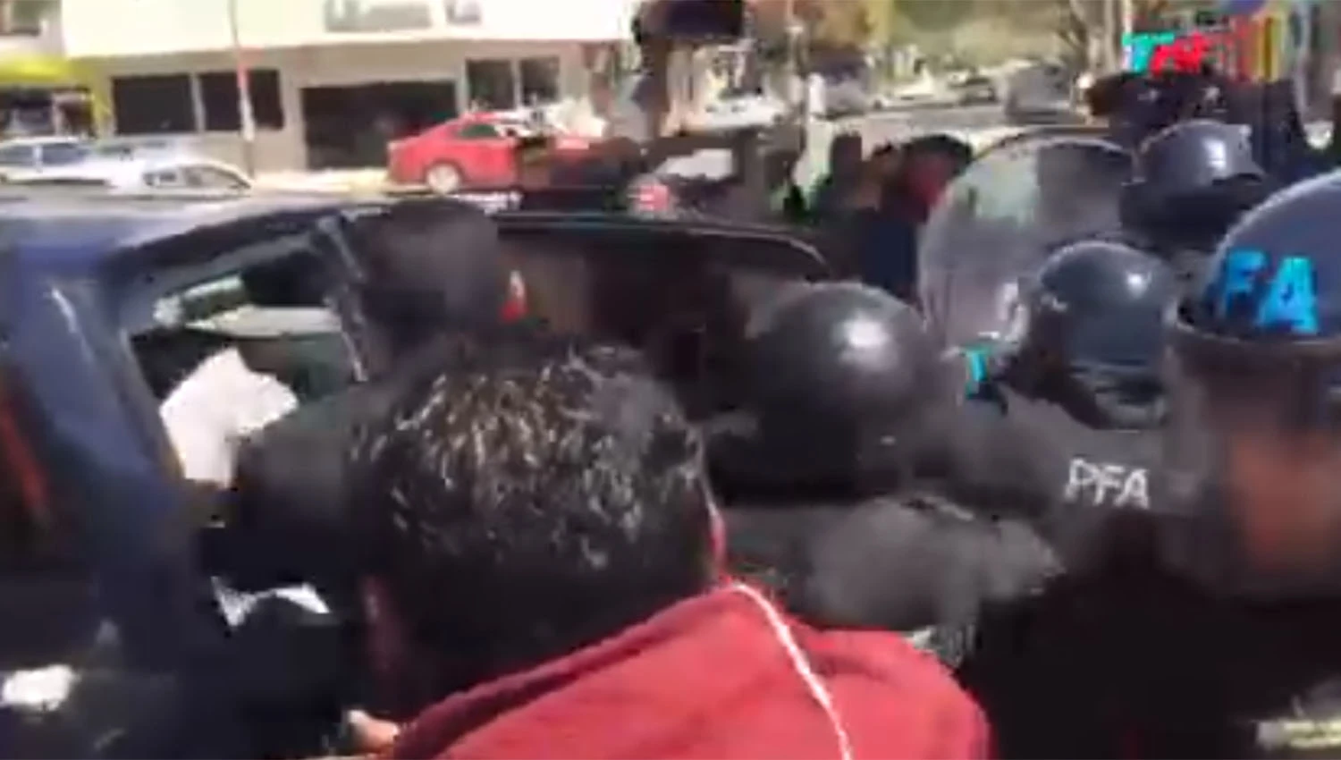 Apenas se abrió la puerta del juzgado los manifestantes se abalanzaron sobre el magistrado, chocando con los policías y arrojando piedras que rompieron algunos vidrios del edificio, mientras otros pateaban y golpeaban la camioneta que esperaba al magistrado.