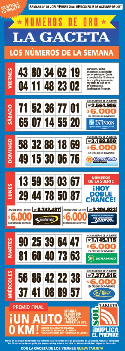 Como cada miércoles, se publicó la grilla completa de los Números de Oro de LA GACETA para que los lectores puedan revisar sus tarjetas. Aquellos que completen los 15 números de una de las grillas de su cartón deberán presentarse en calle Mendoza 654 hasta las 18, que cierra la semana número 16 de Números de Oro. En caso de que el ganador sea usuario Tarjeta Sol, duplica el premio.