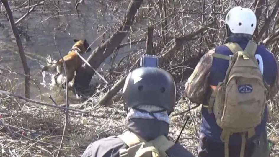 En videos publicados por el programa Periodismo Para Todos se ve al perro llamado "Corban" olfatear el piso, continuando el rastro del artesano desaparecido. El animal siguió el camino hacia el agua, debajo de las ramas de los sauces que nacen en la orilla del río Chubut. Allí se quedó. El canino parece haber encontrado algo, pero los oficiales hicieron caso omiso.
