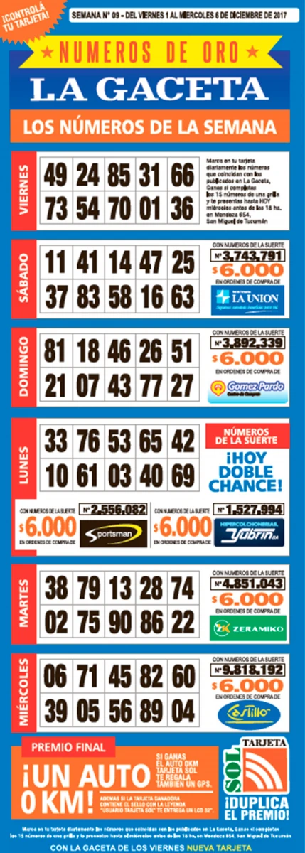 Como cada miércoles, se publicó la grilla completa de los Números de Oro de LA GACETA para que los lectores puedan revisar sus tarjetas. El pozo acumulado esta semana es de ¡$ 600.000! Aquellos que completen los 15 números de una de las grillas de su cartón deberán presentarse en calle Mendoza 654 hasta las 18. En caso de que el ganador sea usuario Tarjeta Sol, duplica el premio.