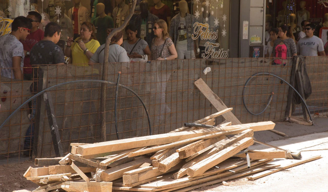 Se acercan las Fiestas y el centro parece un hormiguero. Miles de personas circulan por las calles en dirección a los comercios, a los bancos, al Mercado del Norte... Todos parecen apurados por pagar cuentas y hacer las compras antes de que los precios suban. Pero hay un gran obstáculo que hace que todo parezca más complicado: la obra de remodelación de la peatonal Muñecas al 100, que está demorada.