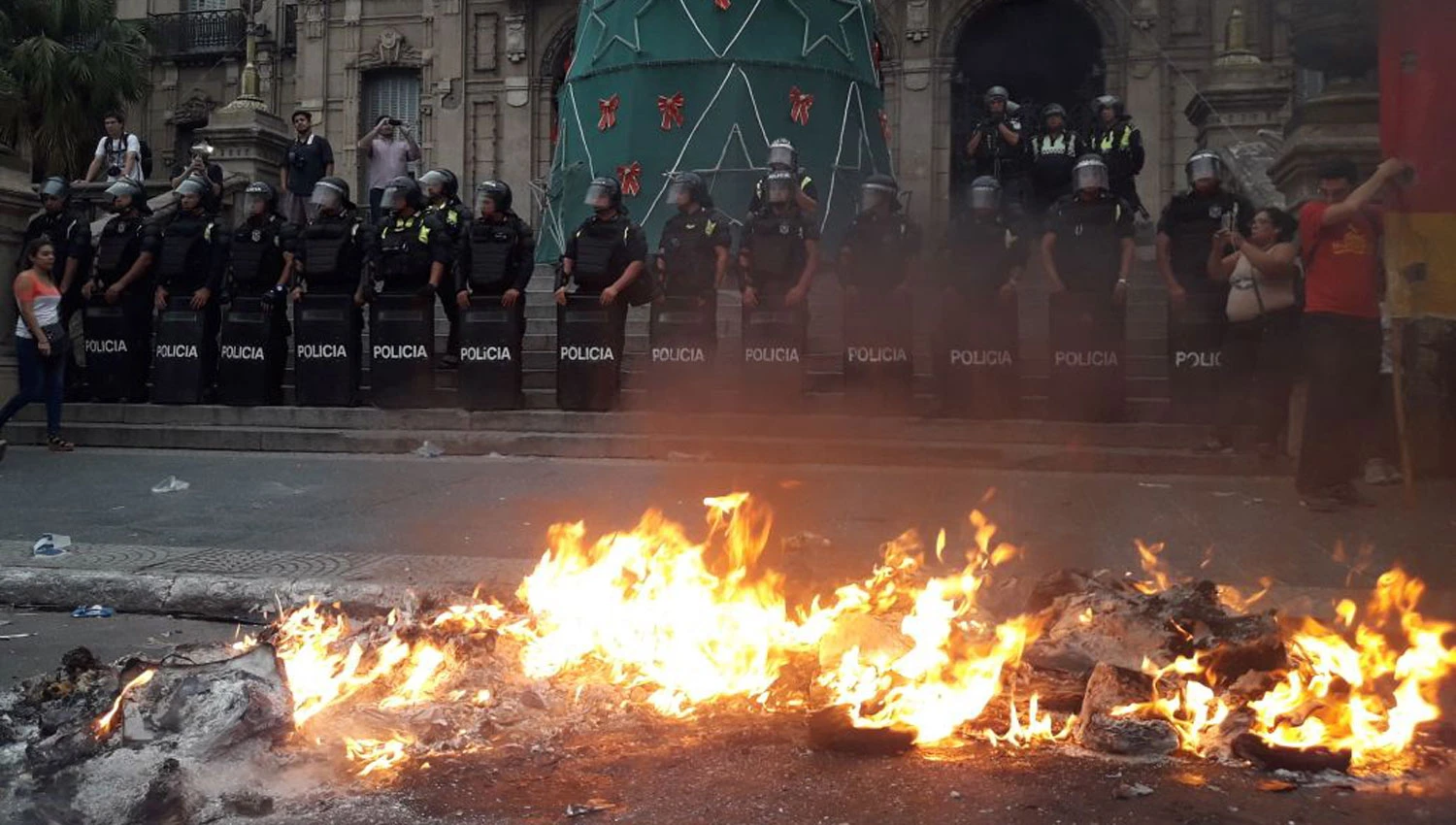 Durante gran parte de la jornada, el clima se mantuvo tranquilo. Pero cerca de las 19, algunos de los manifestantes decidieron prender fuego justo frente a Casa de Gobierno, que es custodiada por personal de Infantería de la Policía.