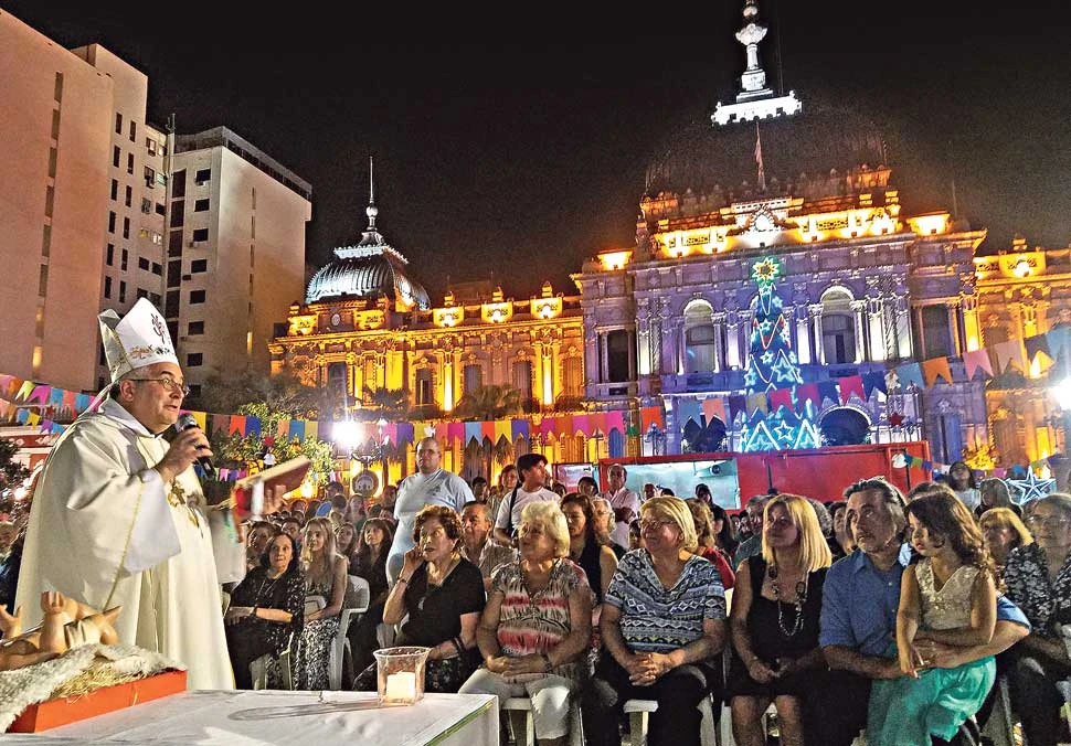 Pasadas las 21.30 llega el arzobispo, Carlos Sánchez, con su báculo sobresaliendo de la mochila. “¡Eh, chango! ¡Qué linda fiesta que han preparado!”, es lo primero que dice, y empieza a saludar uno por uno. La misa de Nochebuena (que tradicionalmente se celebra en la Catedral) se oficia al lado del pesebre de la plaza Independencia. Entre los fieles están la madre y algunos hermanos del arzobispo. Sánchez, en su homilía, resalta el valor de la Navidad, centrada en el Niño Jesús y en la mansedumbre de María, y pide una oración por los tripulantes del ARA San Juan y sus familias y por los más humildes.