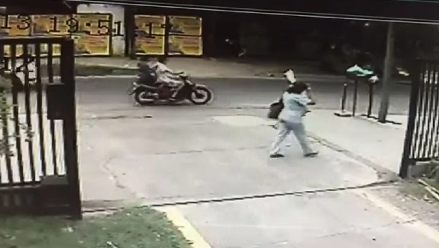 En las imágenes puede verse el momento en el que uno de los delincuentes se baja de la moto para atacar a la mujer que caminaba sola y con la cartera en brazos. Arrastró a la víctima por la vereda hasta que logró quitarle sus pertenencias. Luego, corrió hacia la moto en la que lo esperaba su cómplice.