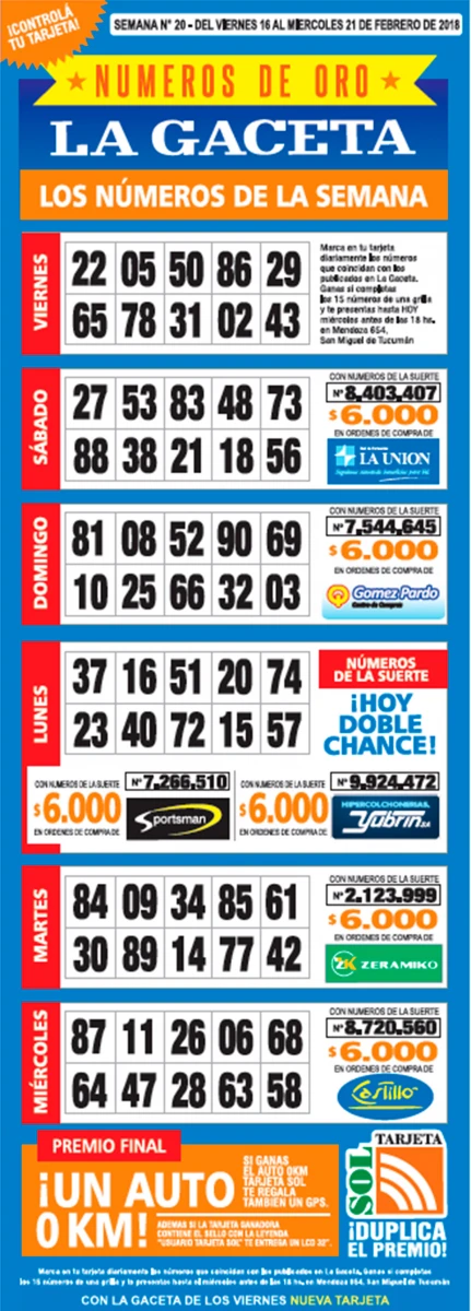 Como cada miércoles, se publicó la grilla completa de los Números de Oro de LA GACETA para que los lectores puedan revisar sus tarjetas. Aquellos que completen los 15 números de una de las grillas de su cartón deberán presentarse en calle Mendoza 654 hasta las 18. En caso de que el ganador sea usuario Tarjeta Sol, duplica el premio. El pozo acumulado esta semana es de $ 400.000. ¡Mucha suerte!