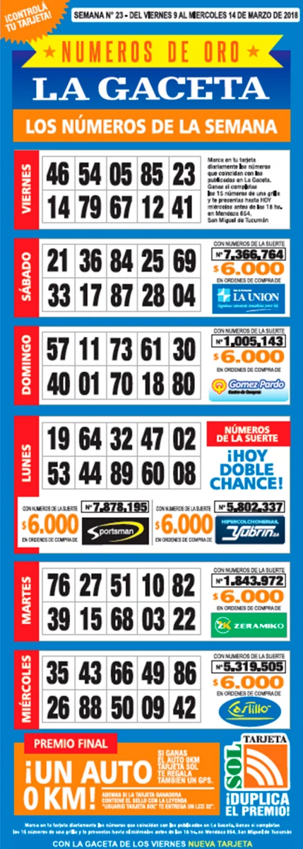 Como cada miércoles, se publicó la grilla completa de los Números de Oro de LA GACETA para que los lectores puedan revisar sus tarjetas. Aquellos que completen los 15 números de una de las grillas de su cartón deberán presentarse en calle Mendoza 654 hasta las 18. En caso de que el ganador sea usuario Tarjeta Sol, duplica el premio. El pozo acumulado es de $ 300.000.