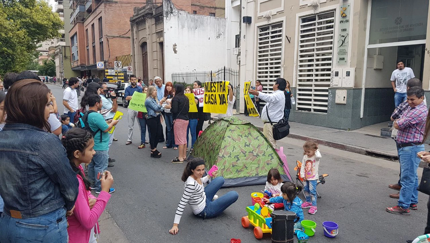 La calle Muñecas al 400 se vio convulsionada por una protesta frente al edificio del Instituto Provincial para la Vivienda y Desarrollo Urbano (Ipvdu). Un grupo de vecinos se reunió para reclamar por las casas que le compraron a la constructora Helpa S.A. y que vienen pagando desde el año 2013.