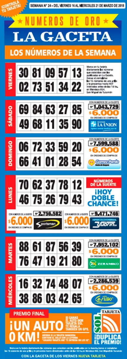 Como cada miércoles, se publicó la grilla completa de los Números de Oro de LA GACETA para que los lectores puedan revisar sus tarjetas. Aquellos que completen los 15 números de una de las grillas de su cartón deberán presentarse en calle Mendoza 654 hasta las 18. En caso de que el ganador sea usuario Tarjeta Sol, duplica el premio. ¡El pozo acumulado es de $ 400.000!
