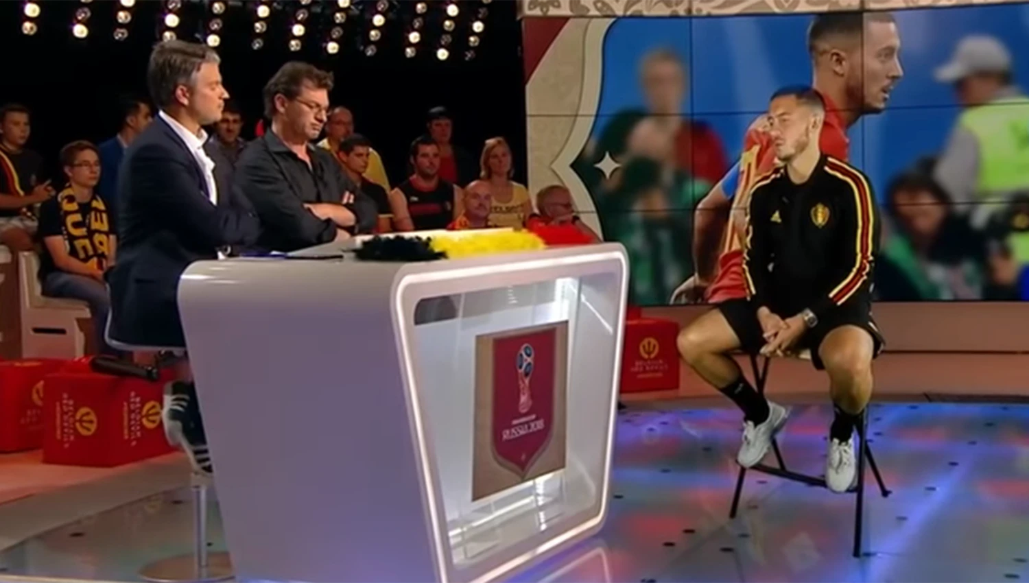 Después del partido con Francia, Hazard salió en vivo desde el vestuario, pero su figura se proyectó como como si estuviese sentado enfrente de los conductores de uno de los noticieros del canal La Une.