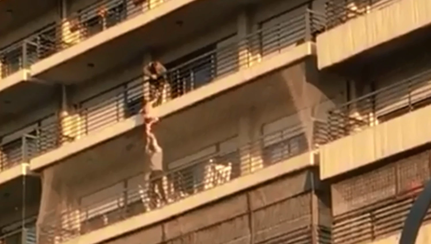 Las imágenes muestran que el chico desnudo quedó colgado del piso octavo. Ante los gritos, un vecino del séptimo piso se estira para sostenerle las piernas desde abajo, mientras que desde arriba otro hombre intenta sujetarlo de las manos.