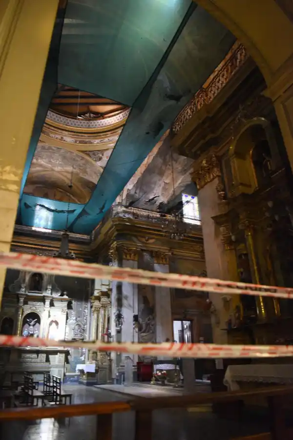 No era solo un pedazo de revoque el que había caído el sábado en el atrio del templo San Francisco. También fue un escombro que impactó estruendosamente sobre el retablo de madera del altar mayor, a poco de empezar la misa. Por eso es que ayer las direcciones de Catastro y de Defensa Civil de la Municipalidad decidieron clausurar el templo, incluida la entrada por San Martín, que se había dejado abierta el lunes para el paso de los fieles a las misas.