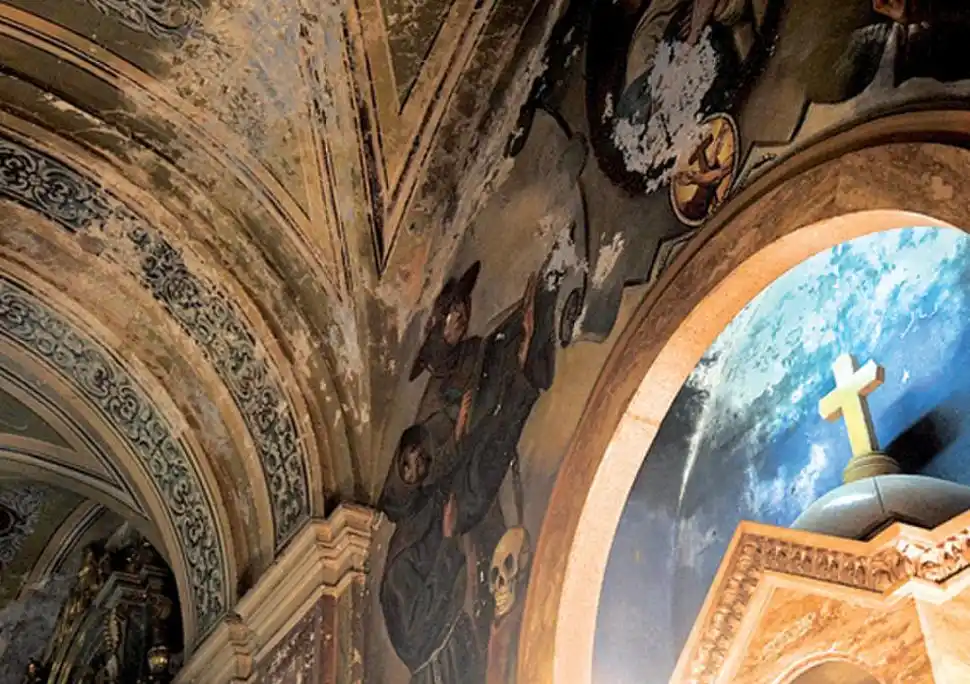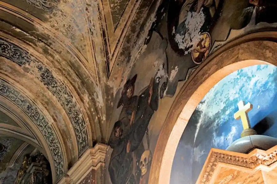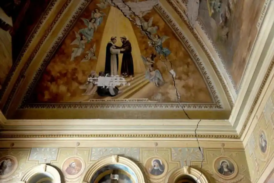 Desde hace un año la sacristía está clausurada, inutilizada por el riesgo que representa. Durante años los frailes se acostumbraron a ver sobre la mesa de la habitación pedacitos de revoque que caían en forma permanente. La cúpula adornada con una famosa pintura del abrazo entre San Francisco y Santo Domingo está partida en dos. La grieta recorre a lo largo la altísima pared y se va abriendo con el paso de los años.