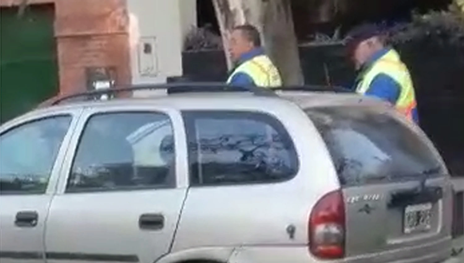 En las imágenes puede verse cuando se acerca a la fila de autos estacionados sobre avenida Avellaneda al 600, frente a la Dirección de Tránsito de la Municipalidad capitalina. Los inspectores, que llevan puestos sus uniformes, se apuran en subir a los vehículos y arrancar.